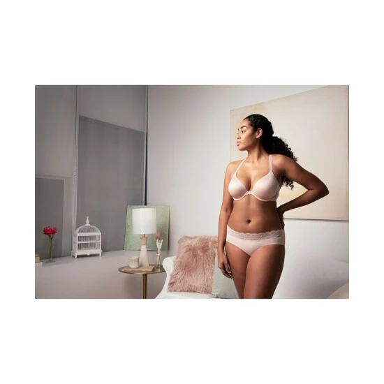 Pillow-soft stretch foam cups and and brushed lace T-back combine for total style and instant smooth curves on b.tempt’d’s front-close bra. Style #953353